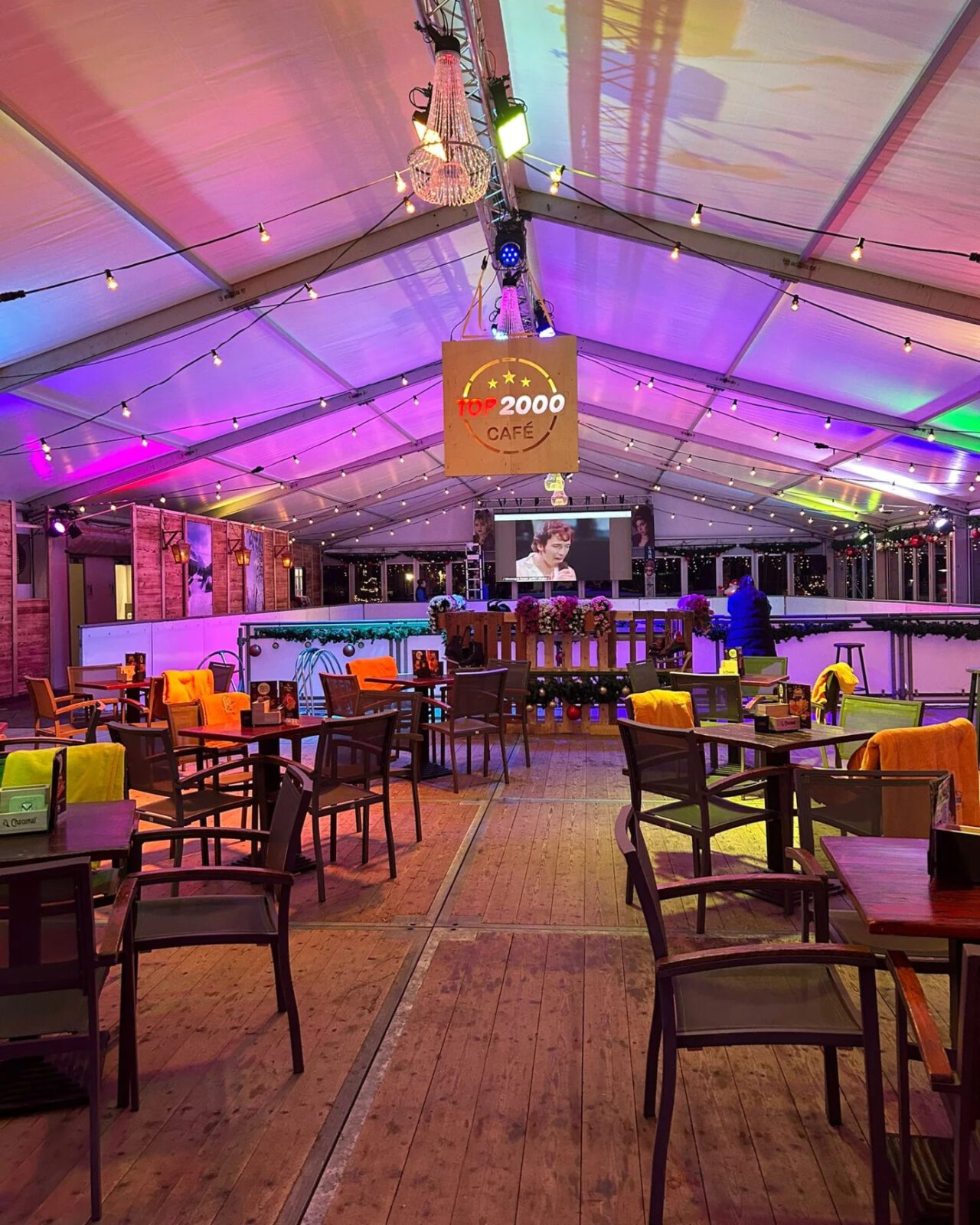 Naast onze schaatsbaan is het ook mogelijk om gezellig te komen kijken naar het schaatsen. Dit kan vanuit het naastgelegen paviljoen. Hier hebben we een gezellig verwarmd terras waar men ook een lekker hapje en drankje kan nuttigen.
